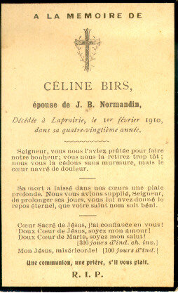 baptême de Jean-Batiste Normandin en date du 19 avril 1823, une carte mortuaire à la mémoire de Céline Birtz
